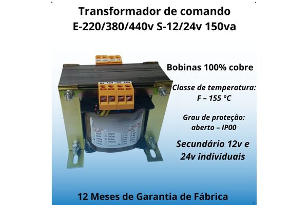 Transformadores monofásicos com potência de 20VA até 15kVA religáveis para tensões de 220-380-440V, com secundário religável em 110-220V ou 12-24V.